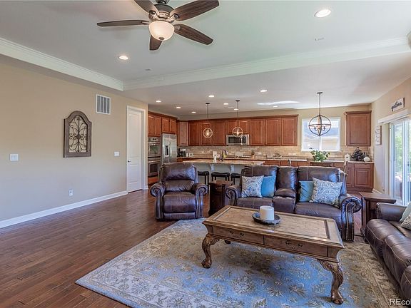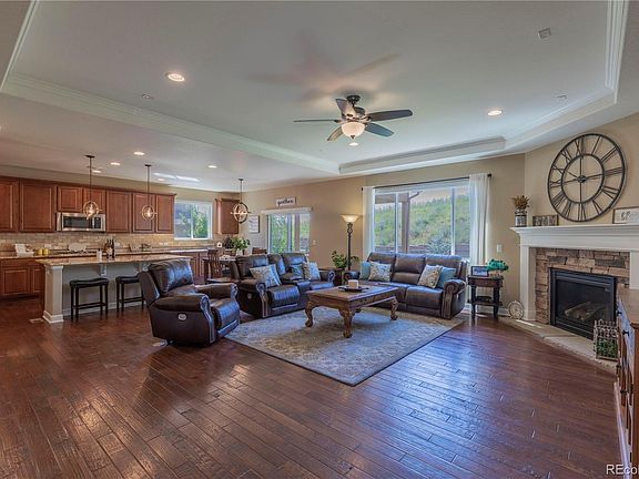 Amazing ranch home in the Cobblestone Ranch community! An inviting front porch welcomes you to this delightful home. Beautiful custom-designed finishes and fixtures in this home boasts of upgrades throughout, including coffered ceilings, stunning hickory floors, a gourmet kitchen with upgraded alder cabinets, granite counter-tops, stainless double-wall ovens, gas range, and a HUGE pantry! Enjoy a great room, study, three bedrooms and laundry on the main level. Fabulous finished basement with rec room, bedroom, bathroom, flex room, and a large unfinished storage area with built in shelving units! Enjoy the private outdoors from the covered patio backing to open space! Cobblestone Ranch is a master planned community and features a club house, pool, tennis courts, parks, and miles of hiking/biking trails. Conveniently located minutes to Parker or Castle Rock! This home is ready for you to move in today!