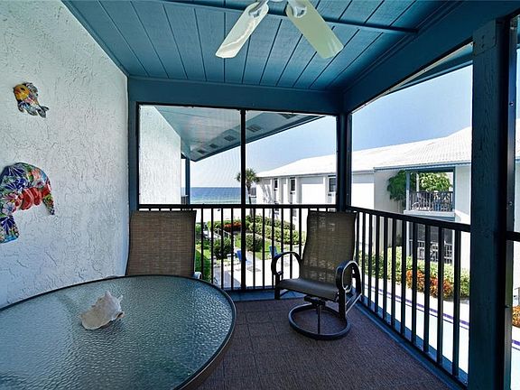 Relax to the sight and sound of the gently breaking waves from this second floor, 2 bedroom / 2 bathroom condo that looks over looks a heated pool to a sugar sand beach on the Gulf of Mexico. Beautiful hardwood floors in the living and dining areas lead out to a roomy screened balcony where you can enjoy the delightful breeze and the Gulf view while eating a delicious meal or reading a good book. Then catch a few rays on the outdoor deck before stepping off on to the beach where you can continue to relax or walk the beach to collect a few shells and get some exercise. The spacious eat-in kitchen features Saltillo tile flooring and lots of cabinet space. In addition, there is a laundry room with space for supplies. Gulfplace also offers tennis courts, an outdoor shower, assigned parking and glorious sunsets. Nearby there is a stop for the free island trolley that travels to the many shops, galleries and restaurants up and down the island. This peaceful retreat on the beach maybe just what you have been looking for. Call your realtor today for a private showing.