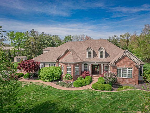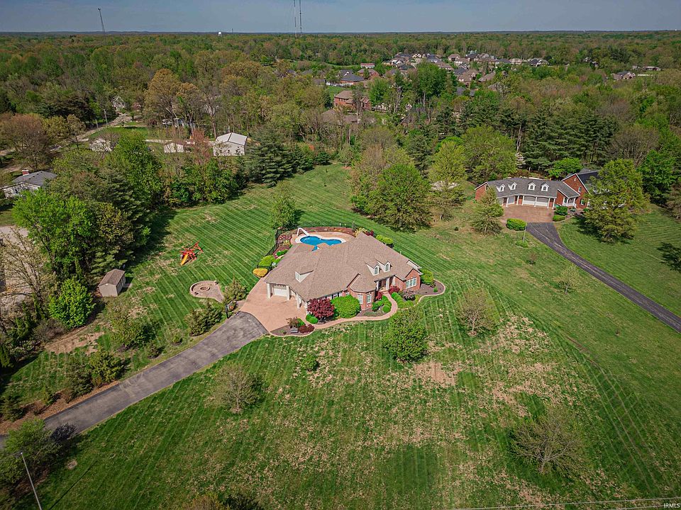 Welcome to your private estate at 6700 Jenner Road in Newburgh. Proudly situated on almost 4 acres of Prime Warrick County ground, this exceptional home is located directly across the street from Rolling Hills Country Club. Built by a builder as his personal residence, 6700 Jenner Road offers 5 bedrooms, 5 full bathrooms, and 1 half bath, with nearly 7,500 square feet of finished living space. The centerpiece of the home is the gourmet kitchen that seamlessly opens to a cozy breakfast nook and an elegant formal dining room. The living room boasts impressive 18+ foot coffered ceilings, a gas log fireplace, and custom built-in shelving, creating a perfect space for relaxation. The main-level primary suite serves as a retreat, featuring double tray ceilings with undermounted lighting, large bay window overlooking the in-ground pool, and a private entrance to the covered back porch. A second bedroom with an attached full bath resides on the main floor adding functionality to this magnificent home. A well-appointed office with an attached full bath, a spacious laundry room, and a half bath round out the main level. Upstairs, you'll find a bedroom and bonus room connected by a Jack-and-Jill bath, along with a media room that includes its own kitchenette for weekend move nights. The spacious walk-up basement consists of a large family room, a second kitchen, two additional bedrooms, a full bathroom, and a fitness room. There's no shortage of space for family gatherings or hosting the games with friends! The basement storage is abundant with thousands of square feet for all your holiday decorations. Step outside to the covered back porch overlooking the custom in-ground pool, offering a perfect spot for outdoor recreation. The expansive yard also features a large stone firepit and a kids' playset, providing ample room for both entertaining. With beautiful finishes throughout, this one-of-a-kind home is the perfect blend of luxury, comfort, and functionality. Join the community of Rolling Hills Country by living directly across the street from hole two and a quick golf cart ride for an evening dinner at the 19th hole!