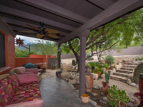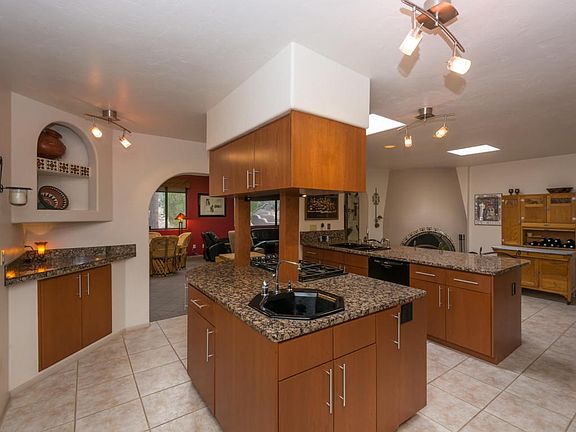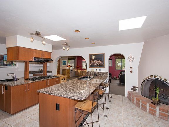 Full of charm, character and artistic flair, this special southwestern home is sure to please with a delightful backyard oasis including 2 covered patios, ramada, flagstone pavers and mature landscaping. Inside the spacious kitchen features granite counters, cherry pull-out cabinets, double islands, Dacor 6-burner cooktop, breakfast bar & cozy beehive fireplace. The living room offers city lights & mountain views, and the oversized family/media room has commercial grade tile. Beautifully updated guest bath w/dual sinks & travertine tile, and the generous master suite has talavera details & jetted tub. Huge laundry room w/ tons of cabinets & counter space could be a great office/hobby/craft area. Dual pane windows & multiple skylights make this home light and bright. Call to see today!