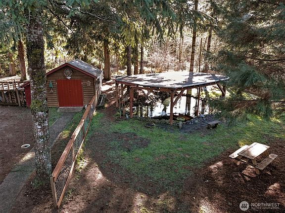 This place is really cool... 3 bedrooms, 2 baths with a great floorplan! The galley style kitchen has a ton of cabinetry and counter space with all of the appliances included (the range is brand new) plus... a really big walk-in pantry with more counterspace!. There is a nice corner breakfast nook that looks out over the garden area, a great utility/mudroom for coming in from the yard, and a really nice primary suite that is seperated from the other two bedrooms. The dining room has a propane stove and the living room has a wood stove so you should never be cold! There is a HUGE, totally covered deck out back that opens to the yard, a covered Koi pond (complete with fish), a waterfall and the goat barn if you are so inclined. The 1+ acre parcel is all fenced and it is a very private setting. Lots of storage in the outbuilding and the big 2 car attached garage with shop space. When it blooms... this property is very beautiful! Just in time for Spring...