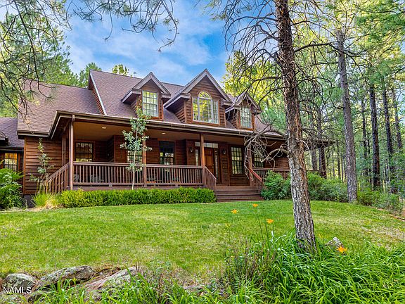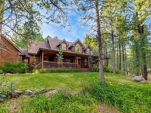 Beautiful West Peak retreat backing national forest! This tranquil home offers 3 bedrooms, 2.5 bathrooms, 3,094 square feet and sits on a heavily treed 5 acres. The spacious great room boasts cathedral ceilings and a wall of windows looking out at the spacious deck, large paver patio and lovely waterfall feature. Perfect for outdoor entertaining and year round enjoyment. The primary suite is on the main level with private access to the exterior, a gas fireplace and vaulted ceilings. The nice sized office is also located on the main level and can easily be transformed into a fourth bedroom. The bonus room is perfect for a larger home office or additional bedroom. This home truly has the location and serenity that every mountain retreat needs with downtown Flagstaff only minutes away!