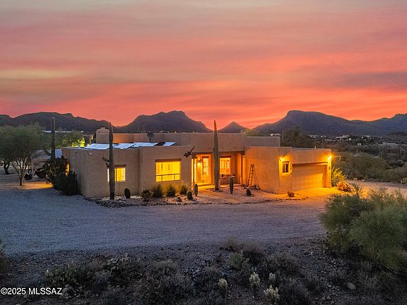Perched atop a private 4.14-acre hilltop parcel, this exceptional residence offers breathtaking panoramic views of surrounding mountain ranges, stunning sunsets, and sparkling city lights after dusk. Located in scenic, Saguaro-studded Westside Tucson, this property blends natural beauty with elegant comfort--and welcomes your horses, too!Thoughtfully designed for relaxed, yet refined living, the three bedroom, two and a half bath floorplan features an open concept living space anchored by a fireplace and picture windows that frame the ever-changing sky. The spacious kitchen is outfitted with generous cabinetry, a center island with breakfast bar and triple-bowl sink, easy-care Silestone counters, stainless steel appliances (including a gas range and additional wall oven) and a convenient built-in desk.