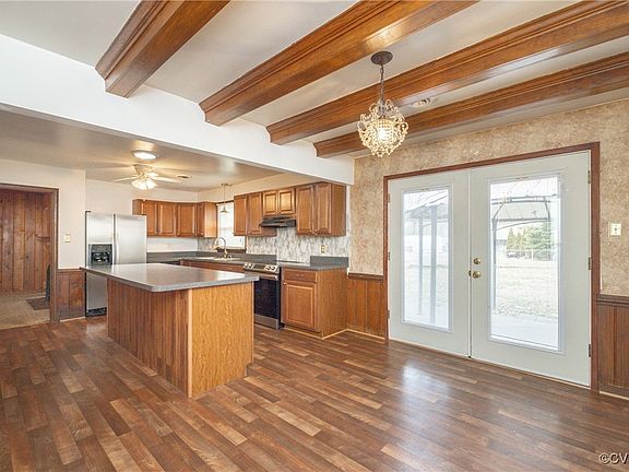 The heart of the home is the oversized kitchen, which offers functionality and charm with its massive island – ideal for cooking, crafts, dining, or entertaining. The open dining area flows seamlessly from the kitchen, with French doors leading to the patio and fenced backyard, creating an effortless indoor-outdoor lifestyle.