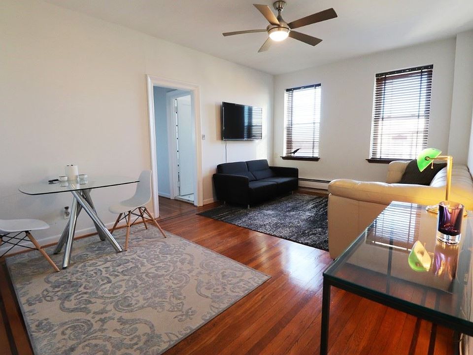 Beautiful, top floor, corner apartment in a pre-war elegant elevator building. Lots of natural light, hardwood floors, high ceiling and large windows throughout. Partial river and George Washington Bridge views. Newer kitchen and bathroom, lot's of storage space and spacious quiet bedroom and living room. Very low monthly maintenance includes - tax, water/sewer, hot water and heat. Building amenities include laundry room, extra storage (additional fee), bicycle room and community garden. Great location, close to parks, stores, restaurants, Hudson river boardwalk, NJ major highways and fast 24/7 transportation to NYC at doorstep