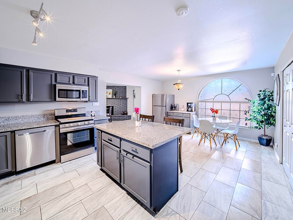 This bright and airy Eastside home was tastefully updated in 2020/2021 and features granite countertops, island w/seating, stainless steel appliances, recessed lighting, 12x24 staggered tile throughout w/carpet in the bedrooms, two large primary suites and all 3 bathrooms modernized. Skylights, fans and barndoors are in all the right places. A stately woodburning fireplace adds comfort to the living/family room and dining area. The North-facing back patio includes a built-in wood burning fireplace. Newer Roof and HVAC in 2021. Located in Warwick Village and sits on a large corner lot with easy access to Davis Monthan AFB, Amazon, Raytheon, other businesses, and amenities. Don't miss out on this beautiful spacious, split 5-bedroom/3-full bath home. No HOA.
