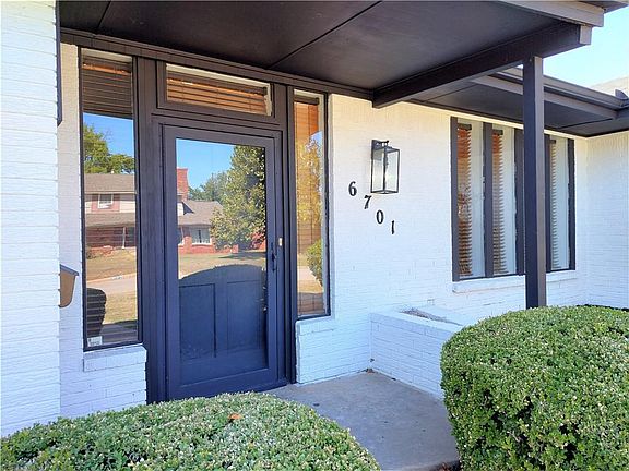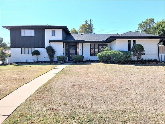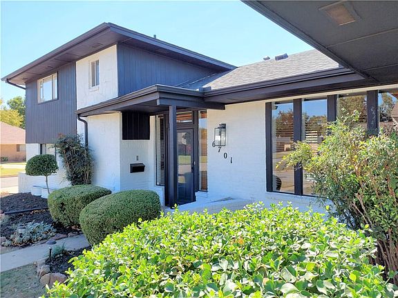 Gorgeous Mid-century Modern home in Edgewater just minutes from Lake Hefner. Beautiful vertical windows & a unique, stand-out exterior. This is no cookie-cutter home. Multi-level, open concept, full of character & unique entertainment space. Ground floor contains 2 living spaces, stunning brick & herringbone shiplap floor-to-ceiling fireplace, a full length wood beam & loads of natural light. Kitchen features granite counter tops, lots of cabinet & counter space, SS appliances, elegant gold hardware & a gorgeous custom tile backsplash. Also on ground level is the primary bedroom w/ ensuite. Lower level includes stackable washer dryer (can remain w/ home), 1/2 bath & a flex space that's open for interpretation; extended laundry area, mud/pool room or study. Upper level includes the remaining rooms & 2nd bath w/ double sinks & vanity space. Backyard is complete w/ open deck & POOL. New pump/filter. All major components less than 1 yr. Newer Roof & HVAC. So much to offer. SCHEDULE TODAY!!