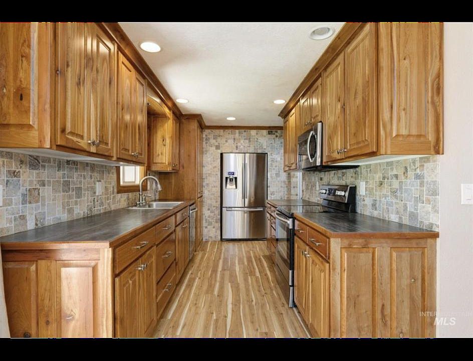 House has 3 bedrooms and 1 bathroom upstairs with the same layout downstairs. Two living room and large laundry room. Oversized garage and large lot with fully fenced yard for pets. 12 month lease.