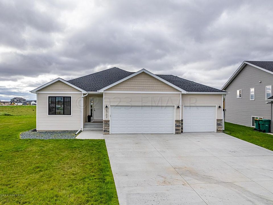 Pond lot with Southern Exposure, Beautiful 4 Bedroom, 3 Bathroom Rambler ! Open & Bright w/vaulted Ceilings, Quartz Counter Tops, large, deep windows overlooking the Patio and Pond. Main floor features a Large Foyer, Full, Hall bathroom, Wonderful Master Bedroom & Master Bathroom w/walk in Shower, large , open living room, Classy Kitchen w/painted Cabinets, Large, Quartz Island, 2nd bedroom, main floor Laundry and Large Patio off of the Dining room. Basement has 9 foot ceilings, 2 additional Bedrooms, Full bathroom, Spacious Family room, Utility room and plenty of storage. Heated 3 car garage, maintenance free siding, shakes & Stone. Easy & Fun living with all the Main floor features: Laminate wood flooring, White wood trim, Classy Painted Cabinetry, Quartz Counter Tops, Vaulted Ceiling.