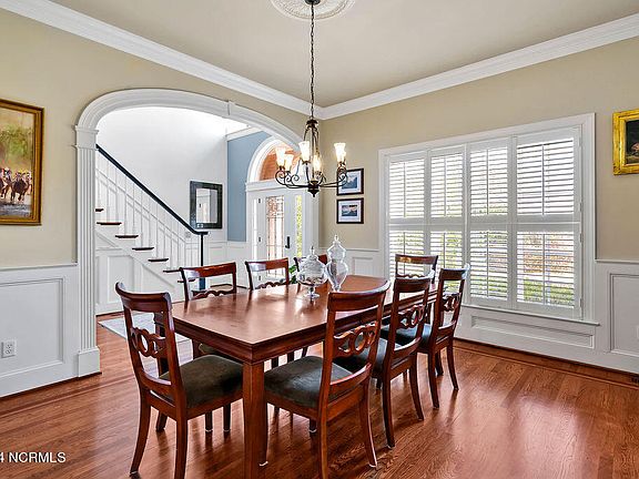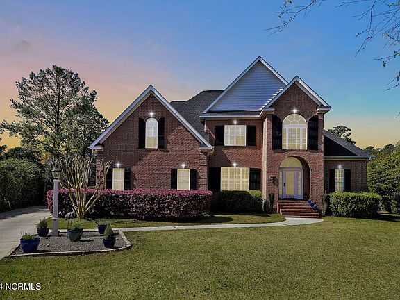 Welcome to your stunning retreat in the highly sought-after Windward Oaks community! This exquisite 2-story brick home sits on a spacious 0.54-acre cul-de-sac lot, offering privacy and tranquility. Step inside and be greeted by a grand foyer adorned with wainscotting and crown molding, setting the tone for the elegance found throughout. With nearly 3800 square feet of living space, this home boasts a large open concept floor plan ideal for modern living. The formal dining room seamlessly flows into the kitchen, perfect for entertaining guests. The heart of the home lies in the gourmet kitchen, where stainless steel appliances, including a gas stove and pot filler, await your culinary adventures. Adorned with beautiful granite countertops, subway tile backsplash, ample cabinetry with under-cabinet lighting, and an inviting island with bar seating, this kitchen is sure to impress. Overlooking the kitchen is the inviting living room, complete with a cozy gas-log fireplace and built-ins. Additionally, a convenient office space and laundry room can be found just off the kitchen. The luxurious primary suite is also situated on the first floor, offering dual closets and an ensuite with dual vanities, a walk-in shower, and a separate soaking tub. Upstairs, three additional bedrooms and two full bathrooms provide ample space for family and guests. A spacious family room/bonus room offers versatility for various lifestyle needs. But the true gem of this home lies outside in the breathtaking backyard oasis. Step into paradise with a saltwater pool, pool house, outdoor shower, and expansive fenced-in yard, creating the perfect setting for outdoor gatherings and relaxation. Lush landscaping adds to the ambiance. Centrally located and within a desirable school district, including Masonboro Elementary, Roland-Grise Middle, and Hoggard High School, this home has it all!