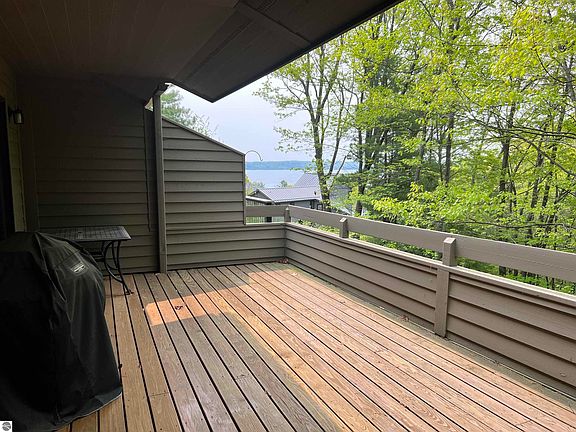 Lovely Port of Old Mission condo tucked into the hills at the base of Old Mission. This is maintenance free condo living close to town yet tucked into a quiet setting. This 4 bedroom/3 bath condo features 2 gas fireplaces; one on the main floor in the living room, which has soaring ceilings and natural light streaming in the big windows. A deck spans the condo, with doors from main living area and master bedroom. Peek a boo views of East Bay are a fun bonus. The finished walk out family room downstairs has 2 bedrooms, a 3/4 bath, its' own fireplace and wet bar, so game day in the fall, Super Bowl in the winter and cool summer nights for movies is just perfect.