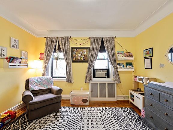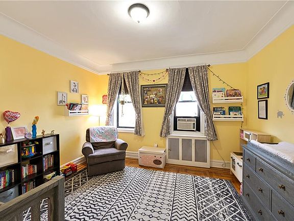This unique and impressive co-op is a great choice for someone that wants a 2 bdrm with low maintenance. This co-op is creatively designed to be very functional and stylish with tons of living space. Thit unit with northeast exposure which offers plenty of natural light. Originally a large one bedroom that was transformed into a beautiful two bedroom plus there is an additional flex room which is currently used as a home office/playroom.. This sunny corner unit features a 16 x 8.2 eat in kitchen with custom designed wood benches that provide for extra seating & storage. The EIK has an abundance of wood cabinets, stainless steel appliances, subway tile backsplash, hardwood floors, great counter space and a lovely yellow accent wall. The kitchen flows to the living area which creates an open floor plan and you can be a gourmet chef while watching your favorite TV show. The king size master bedroom is on the corner and has great ventilation with 2 adjacent windows & parquet floors. The second bedroom is also on the corner and is 1211 x 12.The renovated bath has a window and all new tiles. This apt can be converted back to the original spacious one bedroom floor plan if needed. This 100% owner-occupied building features an art-deco exterior and lobby, live-in super, video intercom system, elevator, bike storage, storage units, laundry room, common garden, and private gym with a wide range of machines and free weights, including elliptical, treadmill, rower, stationary bike, barbells, racks, and benches. Close to the Bay Ridge Ave and near the 59th St station subway stops. Access to the B9, B37, B63, and B64 local bus lines, and one block from the X27 and X37 express bus lines. Near the Bay Ridge NYC ferry stop. Just one block from Owls Head Park and near many of the neighborhoods plentiful green spaces including Leif Ericson Park, American Veterans Memorial Pier, Narrows Botanical Garden, Shore Road Promenade, and the sprawling Shore Road Park.