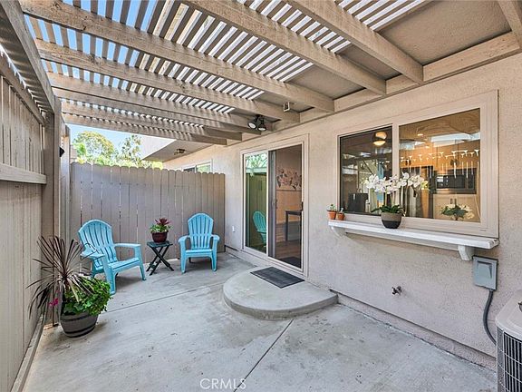 Enjoy coastal evenings on your private patio oasis, featuring a pass-through window, wood fencing, and a charming wood patio cover—perfect for outdoor dining or simply unwinding in the ocean breeze.