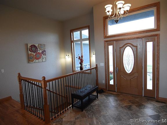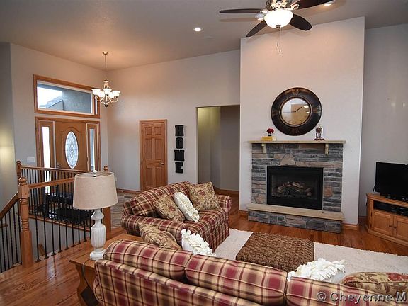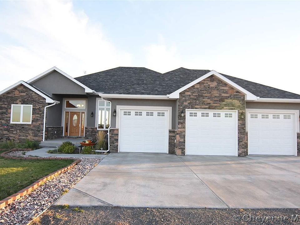 This beautiful custom-built Hayes Construction home is in Fox Run, on acreage with paved roads. This ranch style home with gorgeous stucco exterior sits on a ridge lot with breathtaking views of Cheyenne - enjoy the views on the large covered deck! 2200+SF on the main level with four - yes, FOUR! - bedrooms on the main floor with three full baths. All the custom high-end upgrades you expect with quality. Gourmet kitchen with double ovens, gas range with hood, and lots of countertop space!