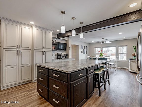 On a private road sits this home filled with character and old world charm. The caliber of detail that has been put into the renovations throughout the years is to be checked out in person. The exquisite Kitchen boasts a 9 x 4.5 ft granite island, GE profile appliance package with Advantium oven and an induction cooktop. An expansive covered patio is right outside the Kitchen doors. The primary ensuite offers walk in shower and a large designer closet. The bathrooms on main level have heated tile floors. Laundry is just outside the primary for your convenience. The cozy Living room has a fireplace and built-in bookshelves. With 3 HVAC units this home could be set up for multi generational living with an extra Flex Room, Great Room and Full Bath on the main floor. Upstairs (cont) you will find 2 bedrooms and full bath. This home is equipped with smart door locks and other smart features, already setup with LG&E smart meter. On the 2+ acres of land sits a Swim Spa with trex decking, a 3 bay detached garage, a 24 x 44 outbuilding with 220 electricity which can hold 4 cars and a circular drive. The out buildings along with the attached 2 car garage could be a business owners dream! The house garage door offers battery backup. Call today for a grand tour of this gorgeous home!