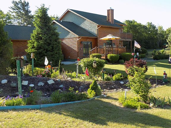 This is a beautiful top notch custom built log sided home that's well built and insulated on one acre of land just 30 seconds away from Portage Lake and Lake Michigan. Open concept design with a beautiful tounge and groove knotty pine ceiling overlooks the entire lower level. A large great room featuring a fieldstone hearth and woodburning stove complements the kitchen for entertaining family and guests. Hickory wood kitchen cabinets along with granite counter tops make this room shine. Black and stainless steel name brand appliances add to the luxury. "Jenair" stove built into a kitchen island add life for gatherings. Large walk-in pantry for extra food storage. Ground level master bedroom has it’s own attached master bathroom along with a generous walk-in closet and second 4' closet with built in organizer. Plenty of large closets, all with organizers, throughout the house. Numerous ceiling fans throughout the house along with central air and natural gas keep you comfortable year round. Outside the house off the kitchen, dining and livingroom area is a large elevated custom built deck overlooking a beautifully landscaped yard. Upstairs are three rooms looking down into the great room which can be used as a bedroom, office or a den area. The upper loft features a large guest bedroom with plenty of closet space, and a full bathroom for guests and family. Also featured is a nice walkout deck overlooking your landscaped yard. The basement of the house is finished with a walkout, 10 foot ceilings, a laundry room with full size washer and dryer, utility sink, 1/2 bath, guest bedroom and large entertainment area. An extra large and deep three car attached garage offers plenty of storage and entry into the kitchen. Beautiful landscaped gardens show off the design of this home on one full acre. An adjoining 1 acre lot may be negotiable if desired. Just a minute away from Portage Lake and two minutes to downtown Onekama, and 10 minutes from prestigious Arcadia Bluffs. Asking $297,900.00. For more information and to schedule a showing call 248-894-4438.