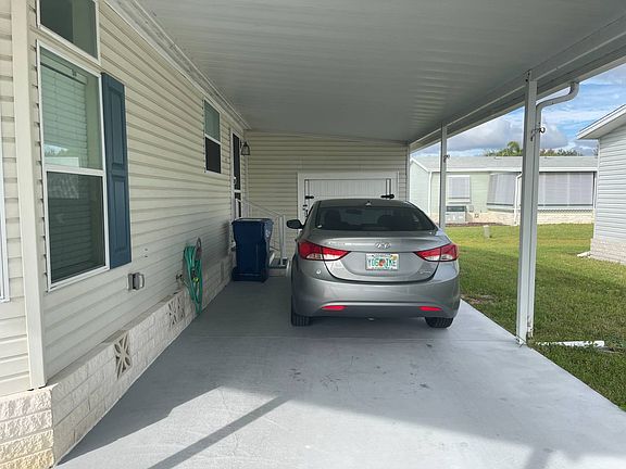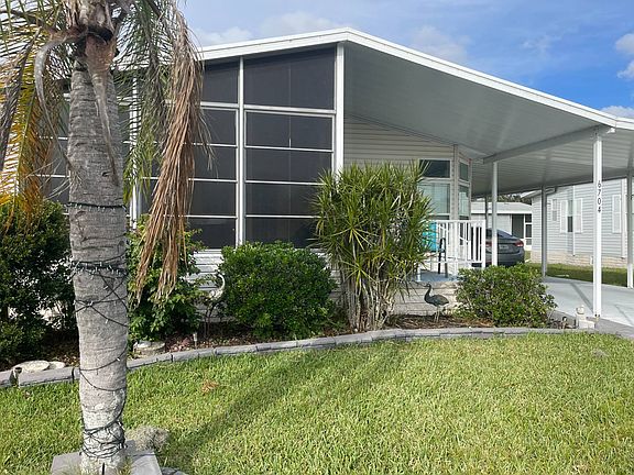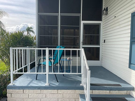 This is a mobile home for sale in a lot lease community. This 2BR/2BA Palm Harbor has vaulted ceilings with a front set screened in lanai (facing South for that natural Florida Sunshine). The 2016 A/C is keeping it all cool! There is 12" tile on the floor in the kitchen and down the hall. There is a breakfast bar in the kitchen and a formal dining area adjacent to the living area. There are plenty of cabinets and counter space in the galley kitchen. All newer appliances included: Refrigerator, stove, built-in microwave, dishwasher plus the indoor washer and dryer in the closet in the front hall. The floor plan is L shaped and opens from the kitchen to the dining and living area. There are French doors that open up to the front set lanai with newer laminate plank flooring. The living room has newer laminate plank flooring, vaulted ceilings, a ceiling fan and sheetrock walls. This home has a master bedroom with newer laminate plank flooring, sheetrock walls, 2 closets and a bathroom en suite. The master bathroom has vaulted ceilings, a skylight, a single sink vanity and a walk-in shower. The second bedroom has newer laminate plank flooring, sheetrock walls, a ceiling fan and a closet. The hall bath is a tub/shower combination with a single sink vanity, skylight and 12" tile flooring. The carport can house 2 cars tandem style. There is a shed on the back for extra storage with a large door that can accommodate parking a golf cart. The lot rent is $919 and lawn cutting, edging and blowing along with the amenities as outlined below. Ridgewood Estates is a well maintained GATED community with 2 heated pools, a hot tub, shuffle board & tennis courts, horseshoe pit, pool side club house with a library, fitness center & billiards room. There is also a large "event" center used for many HOA sponsored events. Cards, Bingo, Chair Volleyball, water aerobics....just to name a few :-)