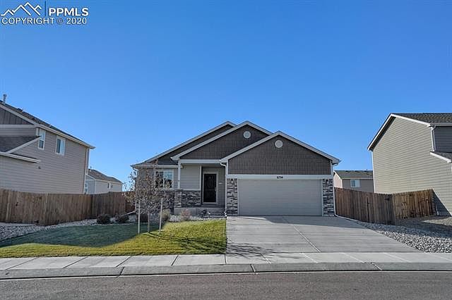 One of the most popular floor plans in Lorson Ranch is available for its next buyer! This 4 bedroom, 3 bed ranch home has tons of space and lots of options! When you enter, you will find a bedroom in the front of the home as well as a full bath. The kitchen has granite countertops, tons of cabinet space, an island, stainless steel appliances and a nice sized pantry. There is also a separate dining nook. The living room has plenty of space for entertaining. The master bedroom is also on the main level with a walk in closet, attached bath with double vanity and separate tub and shower. The basement is finished with a nice recreational area. There are two additional bedrooms and a full bath on this level. The backyard is spacious with views of pikes peak. Do not miss this amazing home!!
