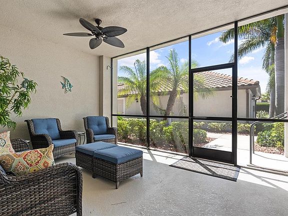 River Strand anyone? Ground floor bright, open plan Veranda unit with 2 bedrooms, 2 bathrooms, den with doors, 2 lanais and a detached garage with GOLF privileges. Experience the epitome of luxury living in this stunning ground floor Veranda condo nestled within the prestigious River Strand, a renowned Resort Style Golf Community. Boasting 2 bedrooms, 2 bathrooms, and a den, this gorgeous residence offers unparalleled comfort and tranquility. Marvel at private panoramic views of the lush greenbelt and breathtaking sunsets from your own veranda. The master bedroom features a lavish King size bed, a flat-screen TV, and a spacious walk-in closet. The adjoining master bathroom is a sanctuary with a vast shower and double sinks, providing ample counter space. The guest bedroom offers two Twin beds and is conveniently located near the second bathroom, equipped with a shower/tub combination. The den, thoughtfully designed as a comfortable office and reading room, also doubles as a guest space with a Queen size sofa bed for visiting family and friends. With two screened lanais one in the front and another in the back furnished with cozy seating, you can unwind in your private paradise, savoring the tranquility of your surroundings. Inside, an open-concept layout seamlessly connects the family room, kitchen, formal dining area, and breakfast nook. The kitchen is a chef's delight, featuring granite countertops, stainless steel appliances, a substantial pantry, and a breakfast bar. Enjoy your meals in the breakfast nook overlooking the family room, which boasts movie-style couches and a flat-screen TV that opens to the refreshing back lanai. This exceptional condo also includes a one-car detached garage for your convenience. Residents have access to a nearby heated pool, and there are seven pools scattered throughout the community for your enjoyment. As part of the River Strand community, when you transfer the membership, you'll have access to outstanding amenities, including 27 holes of championship golf, eight illuminated tennis courts, resort-style pools, a spa, a spacious fitness center, two restaurants, bars, and much more. Current membership price is $572.45 per family. Conveniently located near downtown Bradenton, downtown Sarasota, Lakewood Ranch, beaches, UTC Mall, University Parkway, Lakewood National, and I-75, this condo offers the perfect blend of convenience and luxury. Please note that pets are not allowed. Whether you're seeking a vacation home, short-term rental, corporate housing, or a golf retreat, this unit is your ticket to paradise. 2025 off-season rates are $3,000.00 per month plus electric, water and $70 food per month. High season (January - April), the rate is $5,500.00 per month plus expenses. WELCOME HOME! OPEN Jan - April 2026