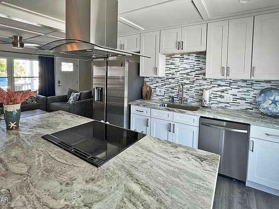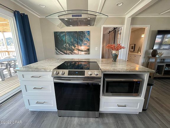 All new appliances included: Washer/Dryer, Island Range/Hood, Refrigerator, Dishwasher, Microwave. New kitchen cabinets w/granite countertops. Huge kitchen island w/seating for four. LVP flooring throughout entire house. All new paint inside and out. Fully furnished; new furniture, beds, bedding, curtains, wall mounted TV's and decor. All doors replaced inside and out. Large covered, back deck w/ table and chairs to enjoy meals outside. Tiki bar w/ electric