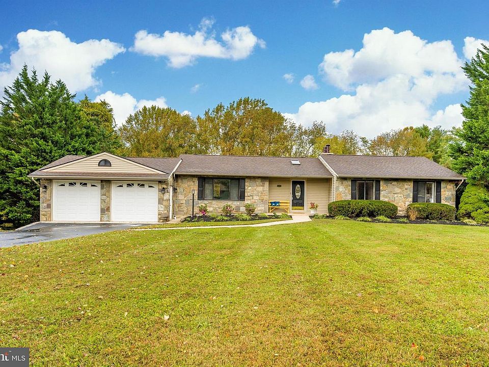 Remarkable 4 bedroom/3 full bath rancher nestled on a private, scenic, nearly 1 acre lot. This rare find offers a huge living room, formal dining room, main level family room with stone fireplace, hardwood floors, custom kitchen with tons of cabinetry, granite, center island + skylight. Primary bedroom with luxury bath + its own deck access. A 2 car attached garage as well as a 5 car oversized (40x44) detached garage with its own separate heating and A/C (perfect for RV parking). Finished walk out lower level is an in-law suite with living room, kitchen/dining area, bedroom , full bath + laundry access, but also a perfect home based business space. Screened porch, multiple decks + lovely landscaping. Easy commuter location + NO HOA!