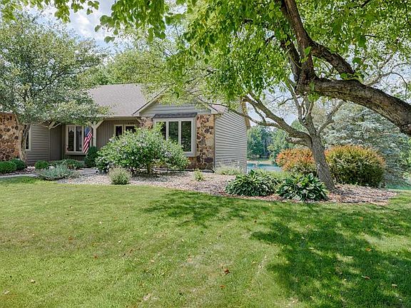 This welcoming one-story home is situated on the lake in Southwest Fort Wayne's Bittersweet Moors neighborhood. Association amenities include a pool with clubhouse, and lighted walking paths around a 12-acre lake. The stocked lake is great for fishing, paddle boating, and simply enjoying from the covered back deck. The tile foyer has crown molding, large sidelights on either side of the front door, and two coat closets. From the foyer, you access the formal living and dining rooms, which feature crown molding and large inset windows. There is also a room that can function as a den or could be used as a 4th bedroom by just adding a closet. Note the solid six-panel doors and beautiful stained wood trim throughout the home. The great room has large windows, wood beamed cathedral ceiling, and stone fireplace with built-in cabinetry on either side. This opens to the eat-in kitchen which features a center island with electric cooktop, a pantry, and Corian countertops throughout the kitchen. A sliding glass door leads to the enclosed four seasons room with vaulted ceiling and a wall of windows. The main floor master bedroom features a nice ensuite bath with closets, a double vanity, garden tub and separate shower. The laundry room has cabinetry, sink and countertop space. The walkout lower level has a large family room with brick fireplace and built-in bookshelves, wet bar with sink, refrigerator and countertop bar seating. There also are two spacious bedrooms, a full bath with double vanity, a rec room, and a fourth room that could be a playroom or hobby room. Additional closets provide plenty of storage space. The attached oversized two-car garage has a workspace and attic storage.