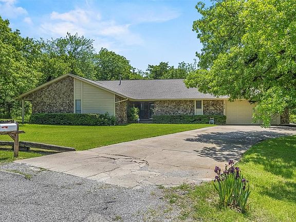 Check out this unique property, nice 4 bedroom, 3 bath home with just under 2,900 sq ft situated on 6.45 acres. Providing quiet, private, beautiful land with LOTS of big trees, hilly terrain, some rock outcrops and a dry creek. You will believe you have found your own "mini Martin Nature Park" or private wilderness area, complete with walking trails. The 5.18 parcel is non platted & has no restrictive covenants. The smaller parcel adjoins to the west & is in the Hidden Hills 2nd subdivision. There are numerous winding walking trails on the property. The entire property is in an unincorporated area of Oklahoma County. Property is approx 600 ft wide on south, 440 ft wide on the north, and about 520 ft deep. The home is built on the NE corner of the property. Most of property is heavily forested, with 3 small meadows on it & around the house is lawn of about 1/2 to 2/3's acres. The immediate backyard is fenced to keep in a dog. There is a large flat grassy area for play or sports, with an approx 14x14 concrete patio nearby. The home has a "lodge like" feel with exterior stone, interior stone & exposed wood beam accents. 4 bedrooms w/mother-in-law suite or home office floor plan. 2 woodburning fireplaces, 1 in each vaulted ceiling living area, built in bar w/sink, perfect for entertaining or coffee bar. Oversized 2 car garage & 20 ft x 24 ft freestanding 3rd car garage/shop building with electricity. Exterior was painted 2021. With 15 varieties of trees on property, numerous species of birds, and lots of animals such as rabbits, squirrels, raccoons, deer, red fox, and turtles to just name a few this is a nature paradise.