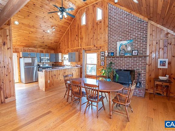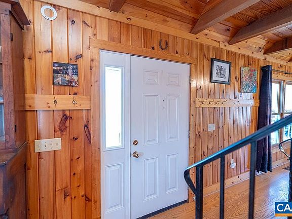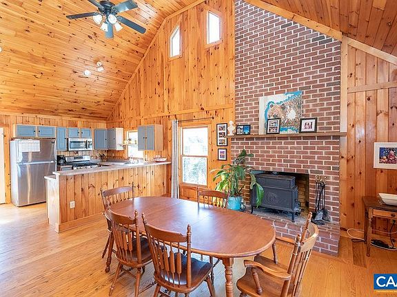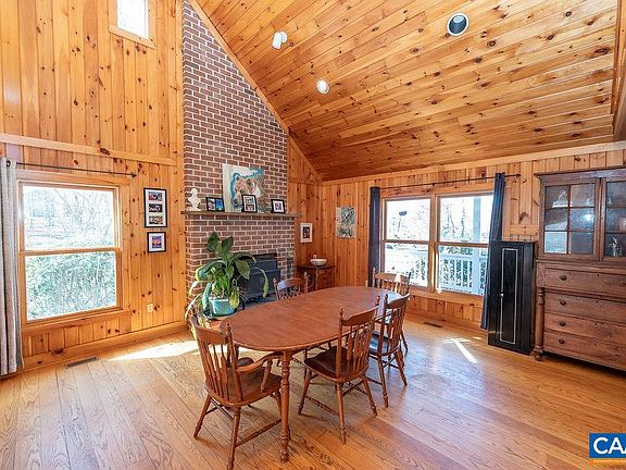 Looking for a quiet, country setting yet only 10 minutes to schools, dining, shopping and everything Crozet offers? This residence offers an open floor plan with tongue and groove knotty pine vaulted ceilings and beautiful hardwood floors. Spacious kitchen and dining area perfect for entertaining with masonry wood burning fireplace and wood stove. Primary bedroom on main floor with two additional bedrooms and two full baths. Partially finished terrace level with family room and large utility room. Enjoy the mountain views from your covered front porch, and spacious rear deck overlooking the private 5+ acres. Bring your domestic animals to utilize fenced paddock with existing shed. Property enjoys mature, perennial landscaping to include multiple variations of bulbs, flowering trees/shrubs as well as edible plants such as raspberries and blackberries.