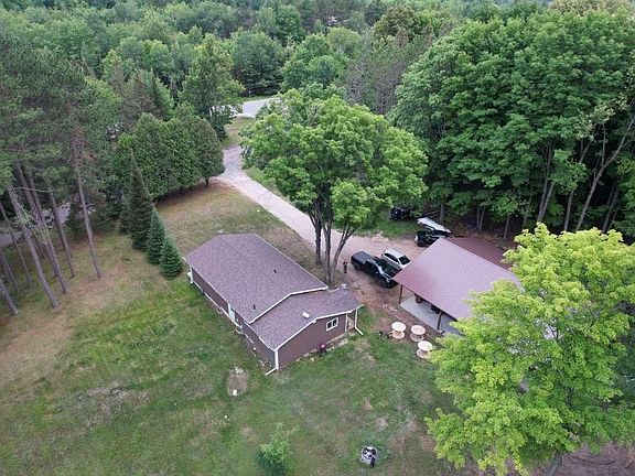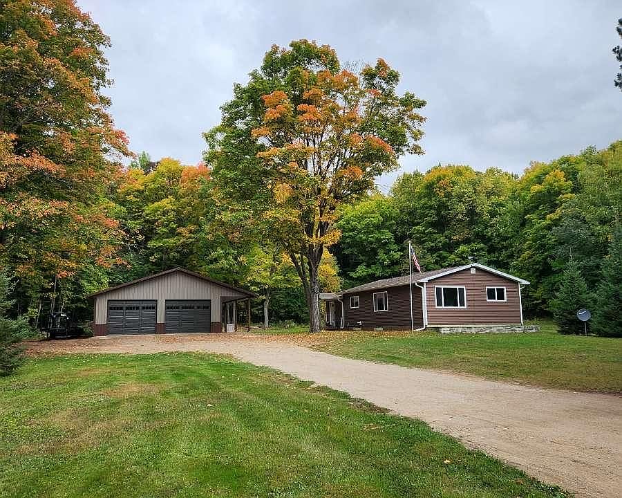 Two bedroom, two bath ranch style home. New garage with concrete slab and additional overhang with a concrete floor. Dimensions are 48 x 32, plus there is a ten foot overhang with concrete floor. There is a 12 x 16 office space finished out in garage. The lot has huge hardwoods and much wildlife. Beautiful wooded two acre lot. Halfway between Eagle River, Three Lakes and Rhinelander. Natural Gas heat, New furnace March of 2023, 200 AMP electric service, all new flooring, LVP, new roof, new gutters, new windows, new siding all in last several years. Like new inside & out. Home was gutted and reinsulated and drywalled. Point well. New survey on order. Don’t miss this one!