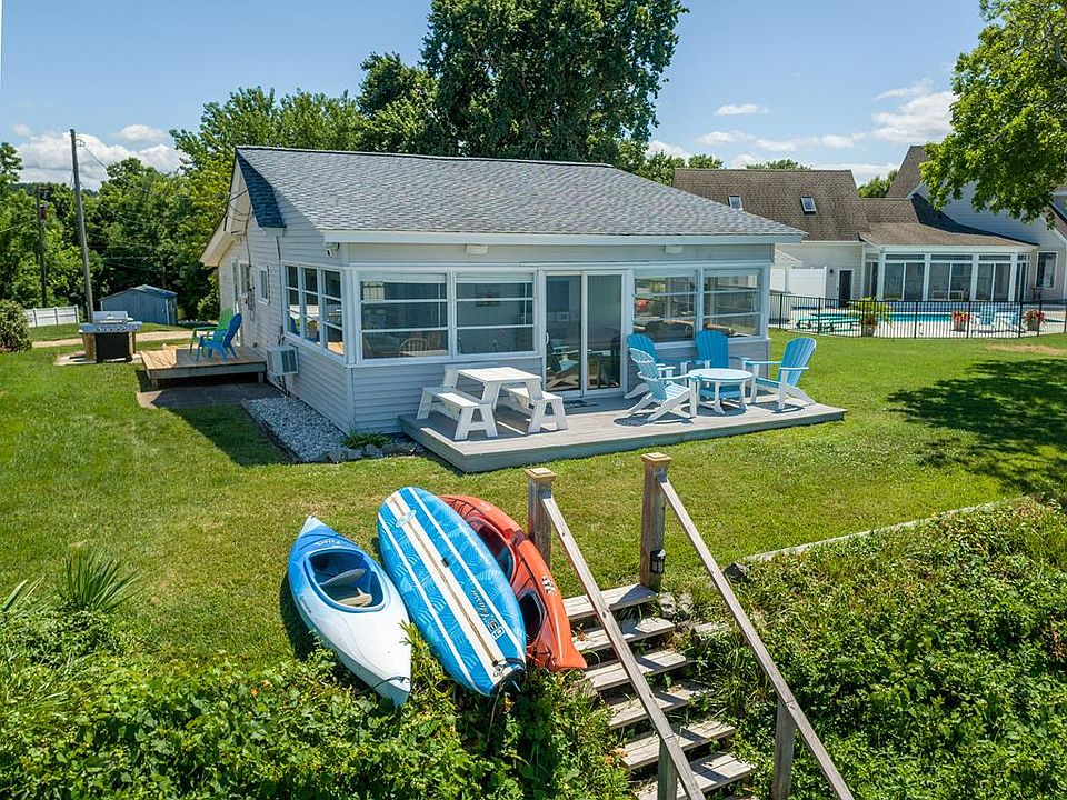The perfect getaway cottage with the best views imaginable. This charming cottage has been totally renovated by the current owners to maximize its square footage and sweet views. Enormous private sand beach and dock with lift and plenty of room for all of the water toys. Darling new quintessential outdoor shower. The cottage consists of open kitchen and large gathering space, 2 bedrooms and 1 bath. Every room is designed to optimize views and capture the essence of beach front living.