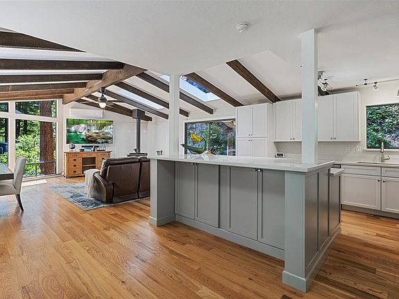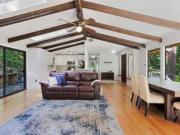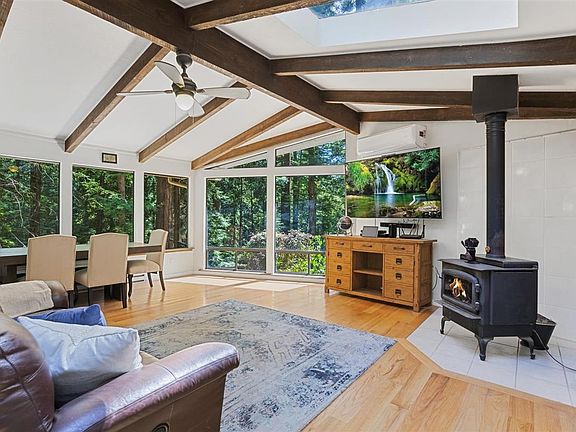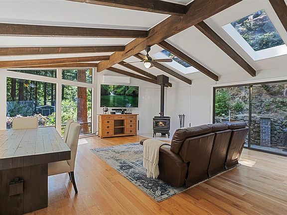 Serenity and style in a charming mountain home nestled in the redwoods and situated on a desirable and easily accessible road. Three spacious bedrooms and two updated bathrooms, with a master suite featuring a large walk-in closet, private deck and hot tub, perfect for star gazing. Open and bright great room and remodeled kitchen offer a modern configuration with vaulted ceilings, floor to ceiling windows, a charming wood burning stove, and access to the rear patio. Recently remodeled kitchen features new cabinets and central island, quartz countertops, and new stainless steel appliances. Two large yard areas offer tremendous indoor outdoor living, with two lawn areas and trails accessing play areas and terraced gardens featuring numerous native and flowering plants including Hydrangeas, Camelias and Ferns. Several custom raised beds and a hot house are also provided for the budding home gardener. Served by top-rated Loma Prieta Elementary and CT English Middle School, Los Gatos High.