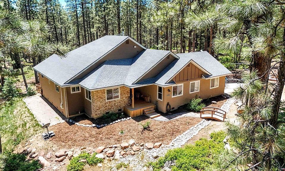 Discover your modern mountain retreat in this stunning single-level home, majestically nestled among towering pines in Colorado. As you approach, the covered porch warmly greets you, leading into a spacious entryway. This home offers a seamless blend of connected and private spaces with its well-thought-out floor plan. Luxurious Acacia solid wood flooring stretches throughout the primary living areas, adding a touch of elegance. The heart of the home opens into a grand great room, perfect for gatherings, anchored by a cozy wood stove set against a backdrop of stacked stone with a cleverly integrated wood storage space. The chef's kitchen is a masterpiece of design, featuring custom cabinetry, granite counter tops, a stylish back-splash, and top-of-the-line stainless steel appliances including double GE Profile ovens, a Samsung refrigerator, and a GE Profile gas range. A large island not only provides additional prep space but also serves as a gathering spot for casual meals. The dining area, surrounded by windows on three sides, invites the outside in, enhancing the bright, airy feel. Step through the sliding glass doors onto a spacious covered deck—perfect for enjoying the serene outdoor setting and possibly spotting wildlife. Storage solutions are thoughtfully integrated throughout the home. The sizable pantry with custom shelving is accessed via a charming sliding door, and the laundry/mudroom is equipped with modern conveniences and built-in storage to simplify your daily routine. The primary bedroom is a sanctuary, spacious enough for a king-sized bed and featuring direct access to the porch. Its en-suite bathroom boasts dual sinks, a large walk-in shower with a rainfall shower head, and a custom-organized closet. This lovely home also has a Whole House Water Filtration System. A second en-suite bedroom offers a peaceful retreat, while two additional bedrooms ensure ample space for family or guests, each accessible from a separate wing of the home. Sprawled across 2.68 acres, the property maintains privacy with its mature pines, echoing the tranquility of a mountain campsite. A fenced back yard, a recessed two-car garage, a delightful play structure with a tree fort, and an included shed enhance the outdoor living experience. Trails for year-round hiking are just steps away, and the nearby Lemon and Vallecito Reservoirs offer abundant recreational activities. Ski enthusiasts will appreciate the proximity to Purgatory and Wolf Creek Ski Areas, while a scenic drive takes you to historic downtown Durango. This exceptional home captures the essence of Colorado living—do not miss the chance to make it yours!