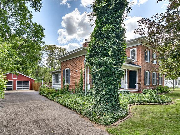 This historic 3 bedroom, 2 bath, Plainwell home is an elegant blend of historic character and modern style. Built in 1855, the Italianate style brick home on a 3/4 acre lot has been reverently preserved, while many modern updates have been thoughtfully added. You'll love the renovated kitchen and dining area with exposed brick walls, newer cabinets, countertops, appliances and gas log fireplace. Also on the main floor you'll appreciate the 10' ceilings in the sitting room, living room and bedroom, along with a laundry with new washer and dryer, full bath and the first of 3 bedrooms. Upstairs is another full bathroom, spacious 10x25 primary suite and the 3rd bedroom. The expansive backyard is fenced and includes a large, multi-level deck, dedicated garden area and even an underground, concrete reinforced, bomb shelter. The 2 stall garage is double deep, with the back portion most recently used as a gym. The roof was new in 2019. Call or text the listing agent or your trusted agent directly to see this home today!