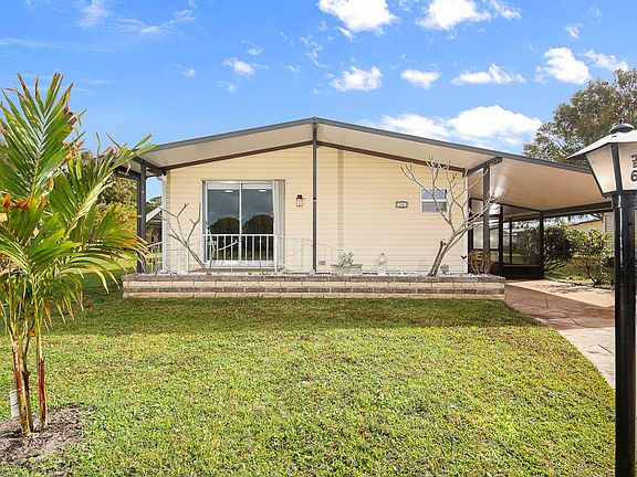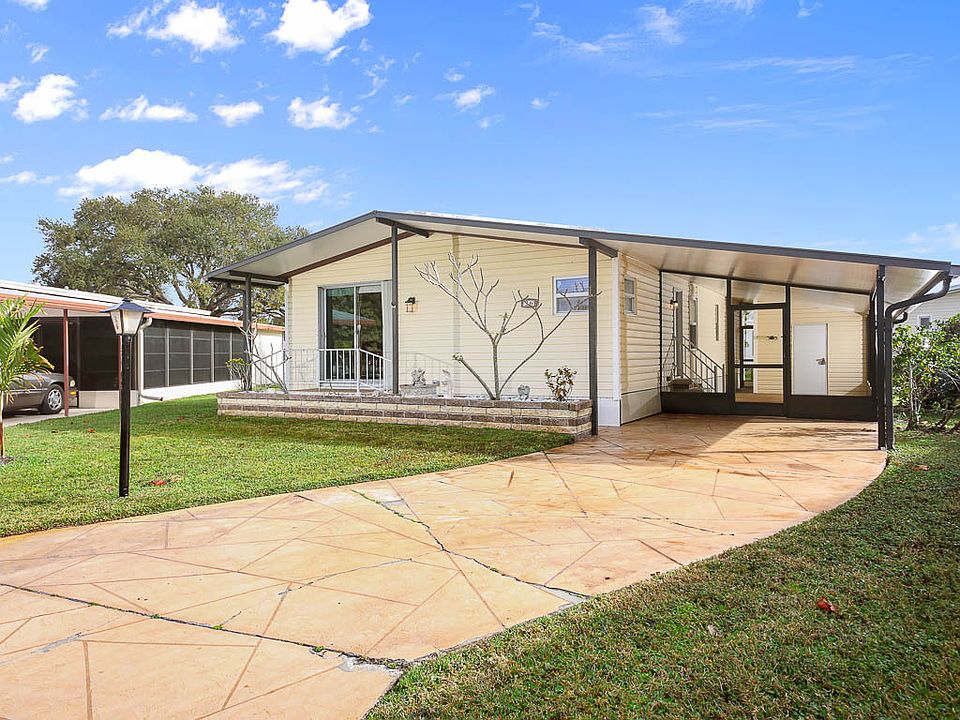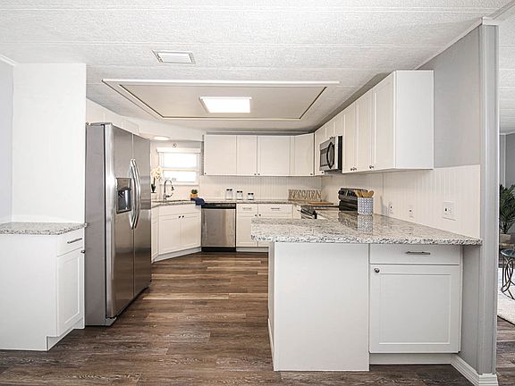 ALL AGES PARK, LAND OWNED, FHA / VA Financing Eligible, PET FRIENDLY, ONLY $160/MONTH HOA/SEWER, BEAUTIFULLY UPDATED, 2015 ROOF, 2015 A/C, 2015 WINDOWS, HIGHLY DESIRABLE COMMUNITY... This home is clean and inviting with large rooms, custom finishes, and is on a quiet street. The home was beautifully updated in 2020 with a luxurious kitchen with new stainless steel appliances, granite countertops with bar-top seating, and bountiful storage with shaker style cabinets. The floors were replaced with a durable vinyl wood-look plank flooring and trimmed with new baseboards. The home is freshly painted in neutral tones. The living room is spacious and light filled with a sliding patio door and 3 windows with blinds. The large dining room has space to maneuver around the dinner table. The large master suite has 2 walk-in closets, a ceiling fan, built-in cabinets, and an ensuite bathroom with a walk-in tiled shower. The guest bedroom is large with a walk-in closet. The guest bath has a double vanity and a shower/tub combo. The home has fold down storm shutters over most of the windows and a non-functioning roll-out shutter over the sliding door, gutters, fully skirted, and blinds in the kitchen, living, and dining rooms. Enjoy lounging by the large community pool, challenge your friends and neighbors to a game of shuffleboard, and enjoy the Clubhouse for community wide events. The home is conveniently located to both I-75 and I-275. This move-in ready, beautiful home is a MUST SEE!