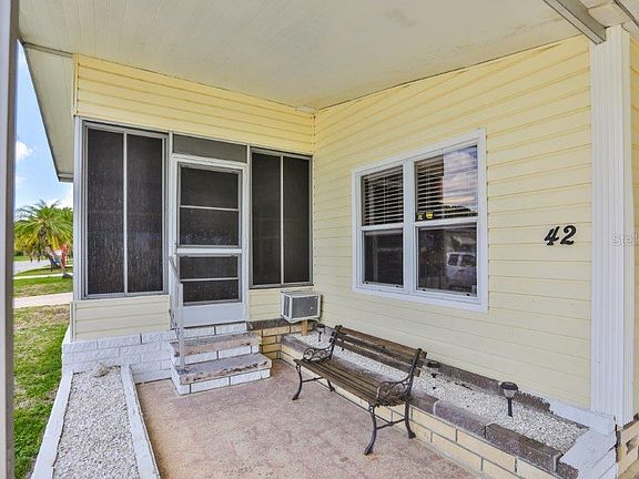 Now is your opportunity to be a proud homeowner of both your home and land in the great community of Shadow Brook. Step inside this charming, cozy and well maintained home and fall in love with the functional open floor plan. The modern kitchen is bright and spacious with stainless appliances and has tons of storage. The living room/dining room combo is comfortable and a great space to gather. The 10 x 11 front porch has been partially finished to become a bonus room for added versatile square footage, but can easily be converted back. There are 2 nice, large bedrooms and modern bathrooms in the home. When you want to relax, retreat to the peaceful covered and screened 11 x 12 lanai. This home also boasts extras such as rich laminate flooring, updated fixtures, neutral paint throughout, newer a/c & ducts and metal roof. The Shadow Brook community has amenities such as a resort style pool, shuffleboard courts, recreation center with pool tables and a library, and is conveniently located to shopping, restaurants, major highways and of course the beautiful Florida beaches. So come and view this lovely home today and see why you'll want to call it yours!