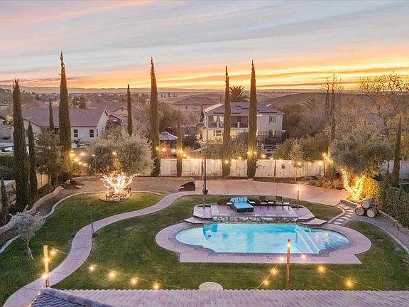 Located in the desirable gated Tuscany neighborhood, this home offers over 2,600 sqft on a 0.41-acre lot. Inspired by Tuscany, this original-owner home blends luxurious living with a serene, vineyard-like atmosphere. The backyard is a true masterpiece designed with entertaining in mind, it offers ample space and is fully usable. Custom stamped concrete leads to a gorgeous inground pool, surrounded by cypress trees, olive trees, and grapevines, creating winery-like ambiance. Set up to accommodate future additions, including an outdoor kitchen with plumbing already in place. Event lighting and space for a dance floor or DJ setup enhance the atmosphere, making it ideal for both lively parties and quiet evenings. Inside, the home features plantation shutters, a fireplace, and a chef's kitchen. The master suite offers a luxurious retreat with a spa-like bathroom. Additional features include a pass-through 3-car garage, a laundry room, and a side gate opening for extra parking.