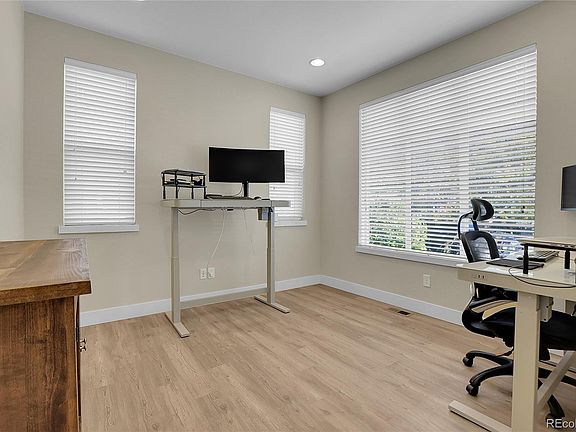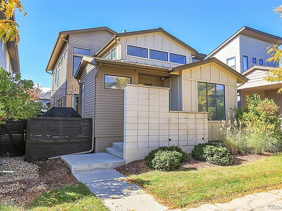 The gourmet kitchen is a chef’s delight, featuring sleek granite countertops, alder cabinets w/custom crown, and an oversized island perfect for entertaining. Adjacent to the kitchen, the dining room showcases a stylish custom minibar with a beverage and wine refrigerator, along with a wall of windows that provide a picturesque view of the outdoors. Convenience meets functionality in the spacious laundry room, complete with cabinetry above the washer and dryer, a folding shelf, and additional wall shelves for ample storage. Upstairs, the bedrooms are equipped with ceiling fans and customized closets, ensuring comfort and organization for the whole family. Step outside to discover your own private oasis! The expansive deck is ideal for summer gatherings, while the low-maintenance astro turf area offers a perfect spot for kids or pets to play. The oversized garage is a standout feature, fully drywalled with an epoxied floor, providing extra storage and workspace. Location is key, and this home doesn’t disappoint! With two schools within walking distance and the nearby Homeplate Park offering a water feature, splash pad, and playground just steps away, outdoor fun is at your fingertips. Plus, a few blocks away, you’ll find a vibrant community with a brewery, clubhouse, restaurant and a neighborhood garden. Downtown Denver is just 10 minutes away, with easy access to Highway I-76 and I-25.