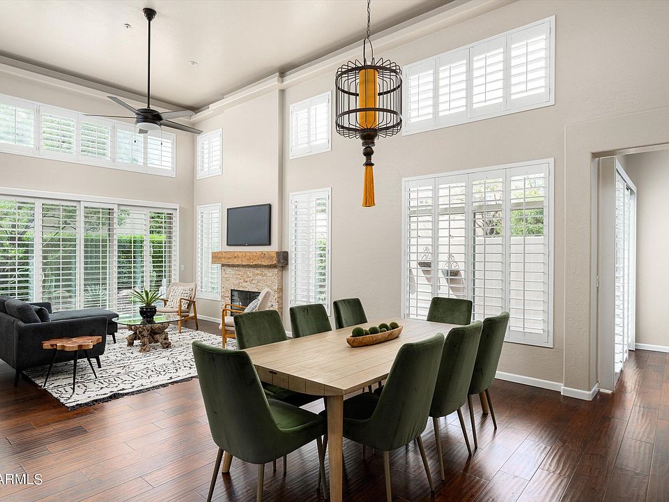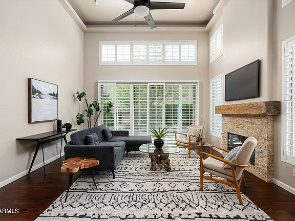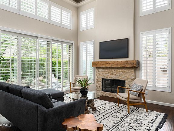 Immerse yourself in the heart of Old Town Scottsdale by living at the Village of Pavoreal. This community gives you effortless access to Old Town's bustling energy while maintaining an incredibly peaceful lifestyle for those looking for a rare 24/7 guard-gated community. At home, step inside and discover the soaring ceilings and abundance of natural light. Enjoy entertaining friends in your renovated kitchen or built in bar. Unwind in the study, or cozy up next to the fireplace during those chilly winter evenings or summer monsoons. Relax in the Arizona sun in your zen desert-oasis backyard, complete with a cactus garden and deployable sunshades. When you're ready for a dip in the pool with Camelback views, this corner-lot home is just a short walk to the community pool, spa, and fitness center. Enjoy Arizona indoor-outdoor living at its finest. This home has no stairs and is all-on-one-level. Don't miss your chance to own this amazing home in paradise!