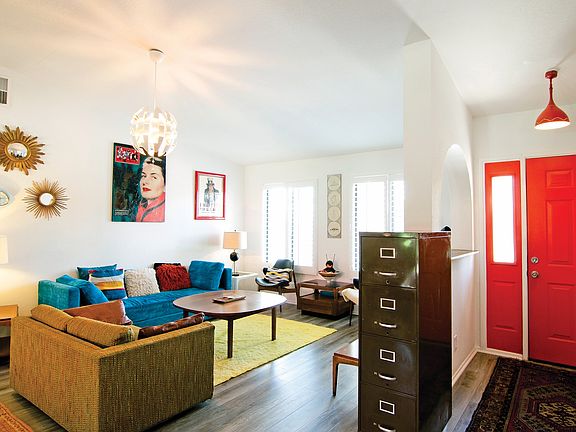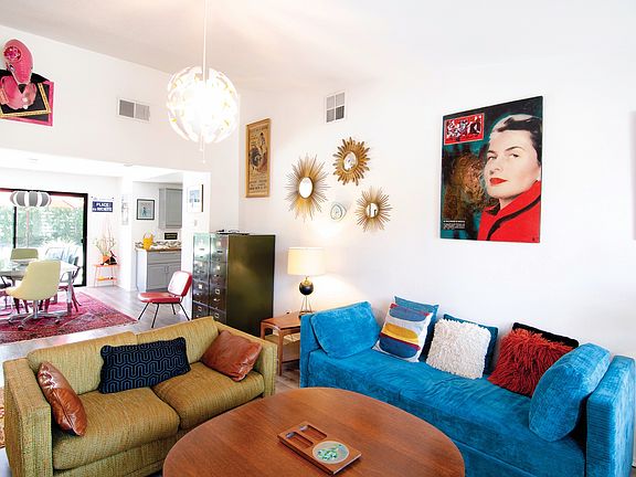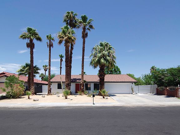 Great mountain views await from this well maintained 2 bedroom, 2 bath home that was fully remodeled in late 2015, including a new pool. The home, located in the desirable Rio Vista neighborhood, features an open concept living room with cathedral ceilings and a spacious dining area opening to the beautiful back yard through sliders. The well-appointed kitchen includes stainless appliances and a picture window allowing you a view of the fully landscaped back yard and pool. The oversized master bedroom has an en suite bathroom and sliders leading to back yard and pool. The two car garage features direct access to the home through a separate laundry room. Fee land, so you own it! Keep the unique vintage furnishings for a turnkey home or vacation rental property (furnishings are negotiable outside of escrow).