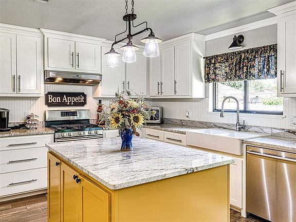 MID-CENTURY CHARMER - Walking distance to Lake Hefner, Hefner Golf Course, Bike/running trails, Stars & Stripes Park and more! Professionally remodeled and ready for you to claim it and enjoy it! Clean curb appeal with modern roof lines and a unique, stone column front porch. Inside - you will love the beauty and durability of wood look tile through the main living areas, kitchen and primary bedroom - (The only carpet is in the secondary bedrooms). Other Recent updates include: Generac whole-house generator powered by natural gas, Double pane windows throughout, Exterior doors replaced 2013, Remodeled bathrooms, Crown molding throughout, and Granite counters throughout. The Kitchen features an expansive custom-built island, window farm sink, stainless appliances, designer cabinet pulls, 5 burner gas cooktop, and elegant stone accent wall. The Primary suite is secluded to the back of the floor plan and boasts a large bedroom, walk-in closet and fully remodeled bathroom. Another hallmark to this home is the DESIGNER GARAGE with Designer glass overhead door, built-in workbench cabinets, epoxy-coated flooring, in-ground storm shelter and MyQ opener with smartphone control. Check out the photos for floor plan, nearby attractions and more features. Call to schedule your showing today!