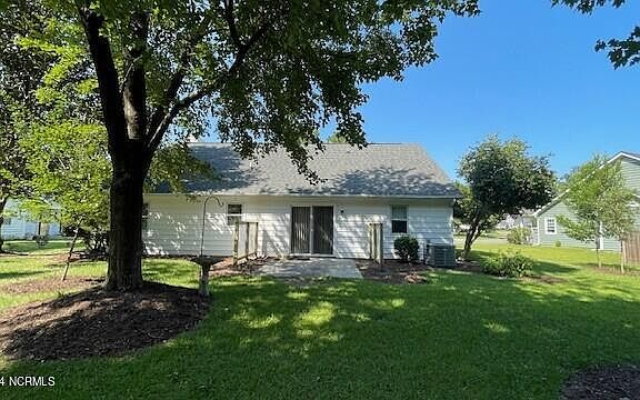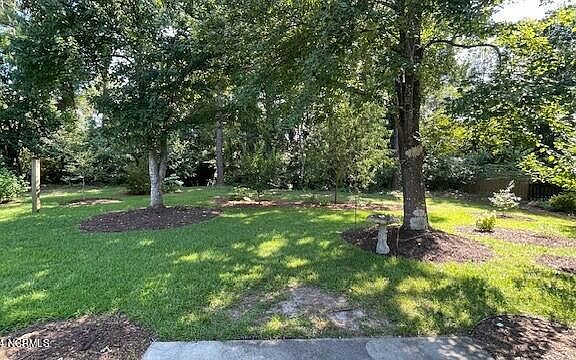 Storybook charm on a gorgeous lot! Framed by mature trees and shrubs with perfect privacy in back, this easy living ranch is inherently inviting from its rocking chair front porch to its secluded patio overlooking a serene parklike backyard. Inside, cathedral ceilings and LVP floors highlight an open plan with wood burning fireplace, eat-in kitchen with generous cabinetry & countertops ideal for cooking & entertaining. The 2 baths are updated and all 3 bedrooms are spacious. Patio access is off Bedroom 3 which could also be a formal dining room as the kitchen access is right across the hallway (previous owner used it this way). There are ceiling fans, a new dishwasher, attached garage with storage shelves, newer HVAC and architectural shingled roof. Ideally located on a quiet cul de sac street just minutes from all Wilmington offers while still incurring only County taxes. Happiness awaits! (Note: Owner is licensed NC REALTOR)