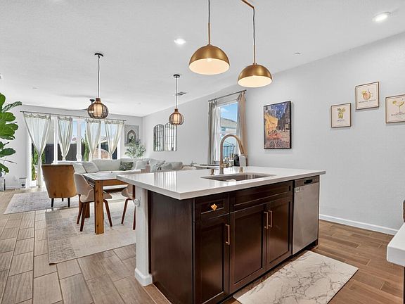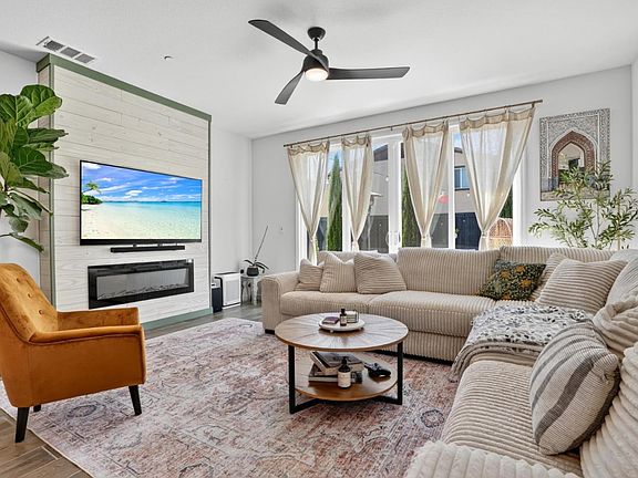 Electric fireplace media wallDurable stone tile floorsDeep single basin sinkPendant lightsQuartz countersAutomatic irrigationSoft close cabinets