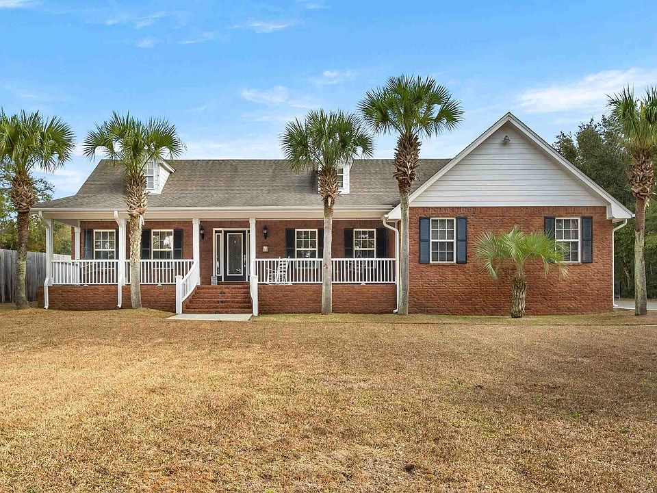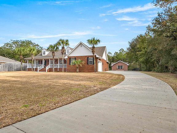 Are you looking for a custom build home perfectly placed on an acre of land, conveniently located in Beulah? Look no further! As you head up the long driveway, you will notice the gently rolling landscape and majestic oak trees behind the three-rail fence. The front of the home is ready to greet your guests with welcoming brick steps that lead to a deep front porch. The front porch swing is waiting for you to end or begin your day. This home was designed with entertaining in mind, offering a huge living room with soaring vaulted ceilings, a formal dining room, a large kitchen with a separate breakfast nook, and a Florida room with windows overlooking the backyard. The kitchen provides plenty of space to prepare your favorite meals in style, with an abundance of cabinet space, a center island, quartz countertops, a mosaic tile backsplash, and stainless-steel appliances. The bright master suite features a walk-in closet and an en-suite bath with a double vanity, a large walk-in tile shower, and 2 linen closets. The split floor plan offers privacy for the master bedroom. There are 2 guest rooms with large closets and office space. Custom stained wood trim and doors, beautiful tile floors throughout the home (no carpet), and a huge laundry room with even more storage are just a few special touches that set this home apart from the rest. Outside, you’ll find a wide-open backyard with a detached 2-car garage (in addition to the 2-car garage attached to the house) and a separate heated and cooled building with spray foam insulation perfect for an art or music studio, home-based business, or even a home gym. There is no HOA and room to park your RV or Boat. All this is just minutes from everything the Beulah area offers and just 2 miles from the Perdido River Nature Preserve with fantastic hiking trails. Don’t miss this incredible opportunity! Schedule your private viewing before this one’s gone.