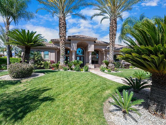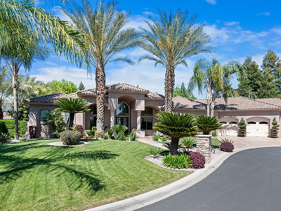 This magnificent home is nestled at the end of a cul-de-sac within the prestigious gates of exclusive Stonegate Estates in NW Visalia. Set on a generous 0.45 acre lot, this sprawling single-story estate is a masterpiece of design and upscale living. Living spaces feature hand-textured drywall, custom cabinetry, stone pillars and arches, and a harmonious blend of hardwood and marble tile flooring and solid wood doors creating an atmosphere of refined elegance and warm hospitality. Soaring ceilings and custom crown moldings add beauty to the great room complete with classic, stone fireplace surrounded by custom cabinetry and bookshelves and provide views of the backyard and gorgeous pool, formal living room and dining room.The heart of the home is a state-of-the-art chef's kitchen, resplendent with gourmet appliances, including massive kitchen island, six-burner gas stove, built-in refrigerator, double ovens, and dual sinks granite countertops and tile backsplashes, beamed ceilings, walk-in pantry, and built-in desk and large eat-in nook. The luxurious master suite is a private retreat designed for ultimate relaxation and indulgence featuring a beautiful fireplace, french doors out to the patio, a luxurious en-suite bathroom with gorgeous marble counters, separate tiled shower, soaking tub, and a massive two-level closet! Two generously sized bedrooms share a jack-n-jill bathroom and access to a private outdoor patio.The bonus room/bedroom has a en-suite bathroom with access to the backyard and patio. The expansive four-car garage includes a tandem bay and a large storage room. Step outside into your very own resort, where a sparkling pool and spa, beautifully maintained yard, outdoor kitchen and large covered back patio are perfect for alfresco dining, lounging and great entertaining!! This home is truly spectacular and a haven of sophistication and tranquility with ample space, privacy, and beauty. Call to arrange your private showing today!