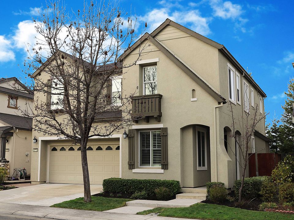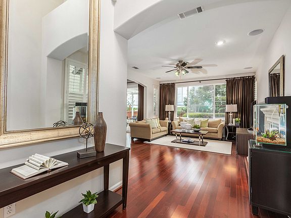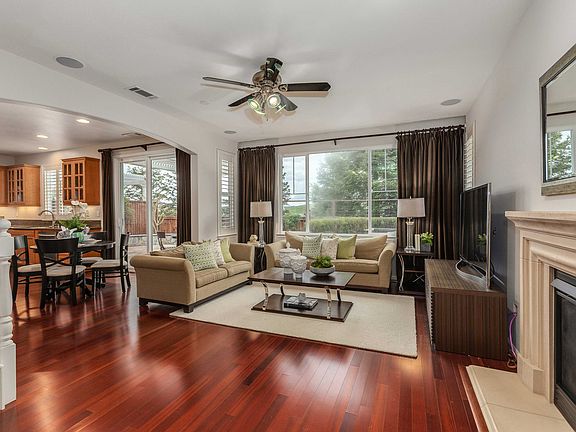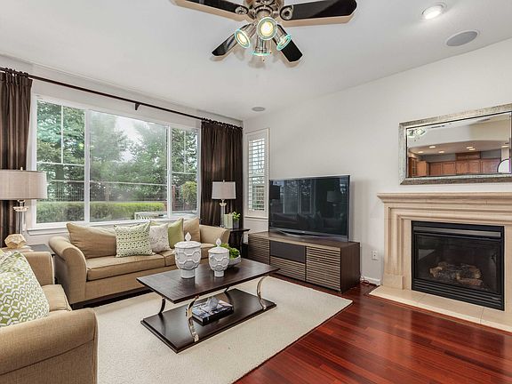 Desirable NE facing front door elevation with southern exposure in backyard on desirable lot-1 bed and bath down-Living room includes gas fireplace, in-ceiling premium speakers, recessed lighting, plantation shutters, and curtains-Gourmet kitchen features separate walk-in pantry, maple cabinetry with under cabinet lighting, double porcelain sink with pull-out brushed nickel faucet, large center island with slab granite countertop, eat-in nook area for dining table set, and all stainless appliances including oven, microwave, four burner professional gas cook top, and dishwasher-Master suite offers in-ceiling premium speakers, neutral paint, neutral carpeting, curtains, plantation shutters, large closet, large walk-in, large soaking tub, dual sink vanity, tile flooring, large walk-in shower with glass enclosure, and upgraded tile surrounds- Beautiful backyard upgraded with stamped concrete patio, arbor, lawn area, mature landscaping, and beautiful views of surrounding hills and trees!