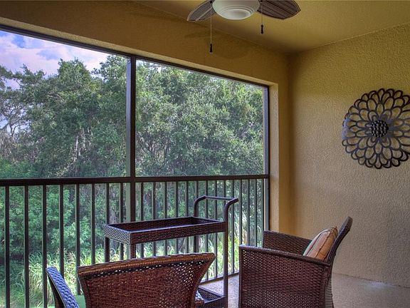 Beautiful professionally decorated second floor 2 bedroom 2 bathroom condo with detached garage River Strand Veranda provides luxury and elegance. Serene private Preserve-Wooded view from the back screened lanai. Additional screened in lanai at front of the property is furnished for cross breezes, relaxation and comfort. The property also offers a Den space furnished as a working office. This condo is Loaded w/ upgrades Including, Stainless Steel Appliances, Granite Countertops, Crown Moldings & a Large Walk-in Closet in the Master Bedroom. Beautiful Community Pool, Fitness Center, Clubhouse, on- site Fine & Casual Dining. $350.00 full Membership transfer required. Riverstrand is one of the areas most elite resort style living and golfing facilities. Pets may be allowed with owner approval.