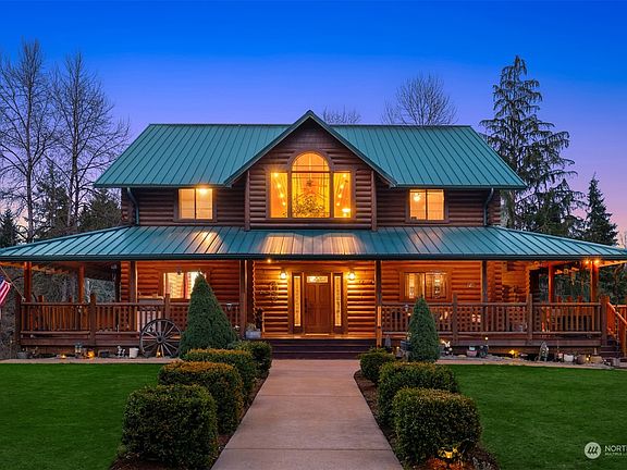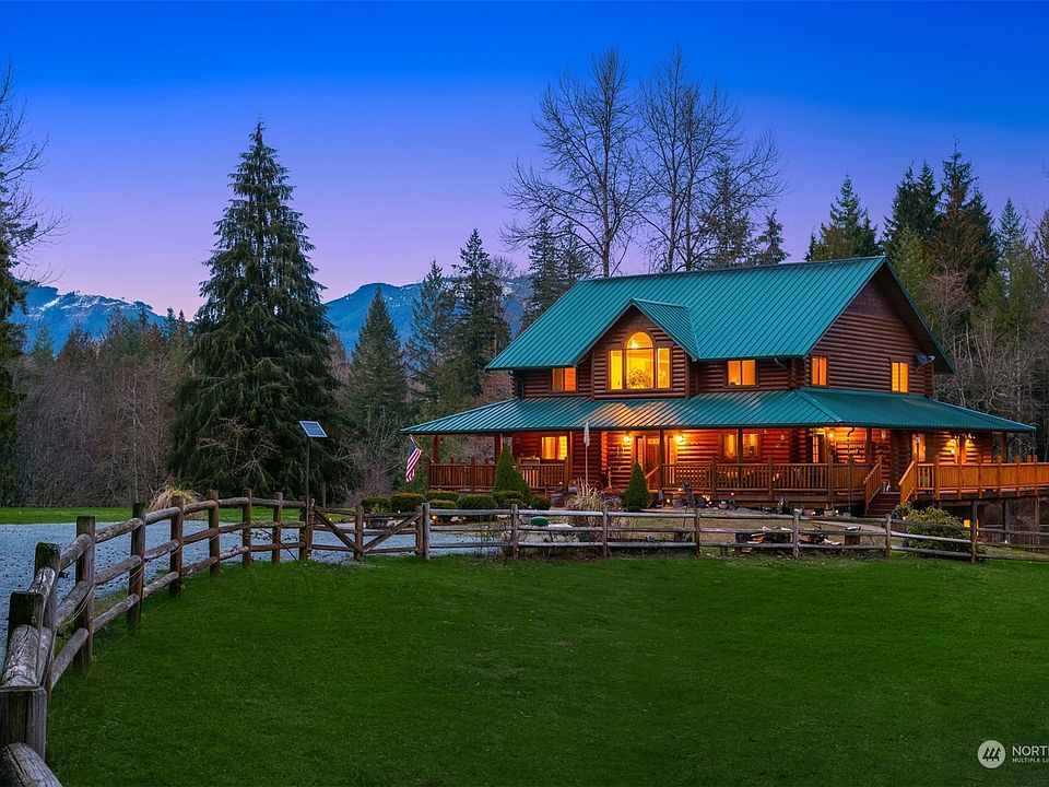 Live the ultimate outdoor lifestyle in this custom milled log home on 5+ acres in Arlington. Enjoy stunning lake/mountain views & daily sightings of wildlife from your expansive deck. Offering generous amenities, including horse stables, outbuildings, pastures & more! open living areas boasting soaring ceilings, a stack stone fireplace, heated floors & remodeled kitchen w/new granite countertops & appliances. Lower level offers more living space & a new ¾ bathroom. A spacious primary bedroom features an updated en-suite & W/I closet. Across the street is Pilchuck Tree Farm, 2500+ acres of trails for horseback riding, hiking, biking & more. This unique property is just mins from Centennial trailhead, historic DT Arlington & Camano Island.