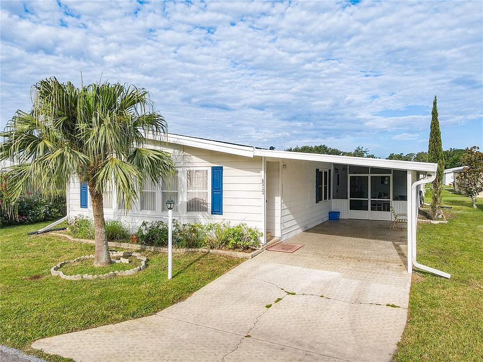 PRICE REDUCED AND NEW ROOF (JULY 2023)! Welcome to 6717 Canterbury Dr in Lake n Golf Estates, a 55+ community where you OWN the LAND!! This home has been well maintained and pride of ownership shows the moment you walk into the enclosed Florida room that serves as a family room. The owner just installed brand new vinyl plank flooring in this room (03/2023). Besides the updated floors and the view out the front windows, the highlight of this room is the full built-in wet bar. This is a very spacious room that takes up the entire width of the home. The owner also added some high-quality furniture to the home in the last year that will stay with the home. Walking through the family room you enter a large living room to the right and a dining room on the left. The dining room has more built-in storage for your convenience. Through the dining room is the kitchen with an area for a table to eat a quick meal or grab a quick cup of coffee or tea. Just past the kitchen on the way to the bedrooms is a built-in desk for all of your work-from-home needs. To the right is the guest bathroom with a shower/tub combo. There is also a large inside laundry room. The washer and dryer stay with the home. At the end of the home is the guest bedroom with enough room for 2 beds and a master suite with an ensuite bathroom with a walk-in shower. The master is a very large bedroom. Both bedrooms feature walk-in closets. Other upgrades include a new water heater replaced in the last year. All windows were replaced as well for better insulation. When you go through the laundry room you will enter a very large screened room. There is plenty of room to entertain and enjoy the Florida weather from this porch. The exterior of the home was just repainted. Through the porch is a large workshop to store all of your tools. Lake 'n Golf Estates is located in Central Florida close to shopping, and restaurants, and located right by HWY 27 and I-4 which is about 1,5 hours to each coast and within 1 hour to the Disney parks. The community offers a heated pool, hot tub, shuffleboard, and boat dock to Lake Henry which is a wonderful fishing lake. Lake 'n Golf Estates is a no-pet community and only charges $ 500-a-year HOA fee which makes this one of the more affordable places in Central Florida!