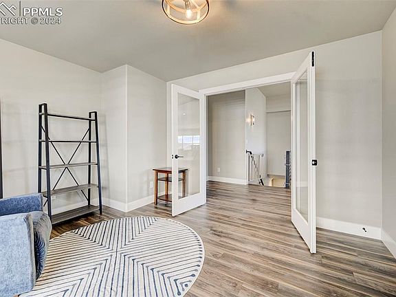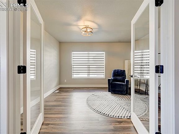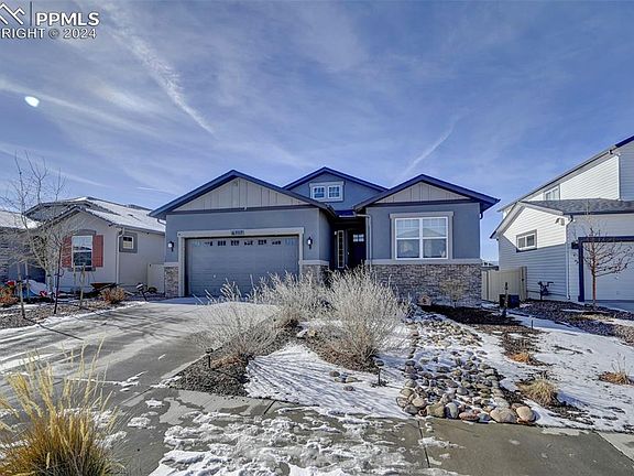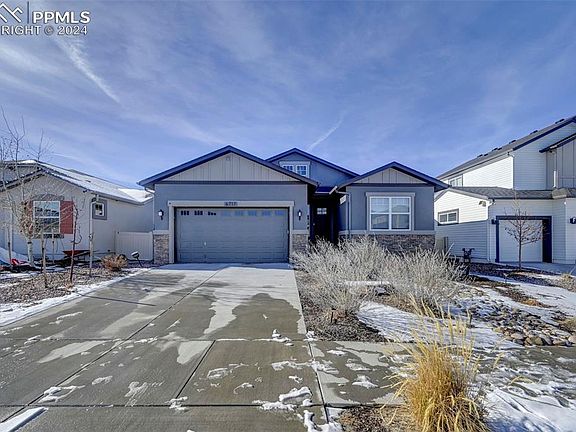 Welcome home to this exquisite Craftsman-style property featuring a charming stucco and stone exterior and Pikes Peak views. From the moment you step inside, you’re greeted by an open, inviting great room with a cozy gas fireplace and seamless access to the spacious composite deck—ideal for outdoor dining and entertaining. The gourmet kitchen is a chef's dream, boasting maple soft-close cabinetry, pristine white quartz countertops, a stylish Kohler farmhouse sink, and a large island. Stainless steel Whirlpool appliances, including a gas range, complete this perfect cooking space, all drenched in natural light from expansive windows. Retreat to the main-level owner’s suite, featuring a luxurious 4-piece bath with a spacious walk-in shower and walk-in closet. The main floor also offers a second bedroom, a full bathroom, and a private study with elegant French doors could be used as a formal dining room or 3rd main level bedroom. Convenient main-level laundry connects directly to the oversized 2-car garage. The fully finished lower level is an entertainer's paradise, with two additional bedrooms, a full bathroom, a sprawling recreational area, and a full wet bar perfect for game nights or movie marathons. Need storage? You’ll love the generously sized unfinished space! Outside, enjoy a beautifully landscaped yard with a vinyl privacy fence, irrigation system, and air conditioning. This home combines thoughtful design, modern amenities, and incredible mountain views. Don't miss this one-of-a-kind opportunity!
