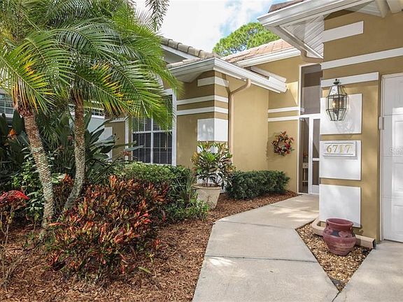 Located in the award-winning community of University Park Country Club. Large oak trees line the entrance and the shimmering lakes with expansive golf greens make the drive along the main community road relaxing and the feel of tranquility. Enjoy this beautiful 3 bedroom/ 3 full bathroom home with a two-car garage without the worries of taking care of the yard in the maintenance free community of Virginia Water. As you enter the home, there is a screened entrance alcove. Inside, volume ceilings and open views from the foyer, inviting living room, lanai, saltwater pool and lush back yard. Kitchen has tile floors, solid surface counters, gas range, a cozy window bench seat and corner windows over the sink. Front guest bedroom enjoys a private bath with walk-in shower. Second bedroom can access the hall bathroom that also has a walk-in shower. Master bedroom has a very generous walk-in closet with large shelf storage space above. Lovely windows overlook the pool area and back yard. Master bath has a jetted soaking tub with a large glass block window. There is a separate shower and spacious dual sink vanity . The glass enclosed lanai off of the living room is a bonus entertainment area with pocket sliding glass doors and an individual wall air conditioner. The screen enclosed saltwater swimming pool and spa has a lush view of the preserve. Mature foliage and trees add to the privacy and beauty to this lovely home.